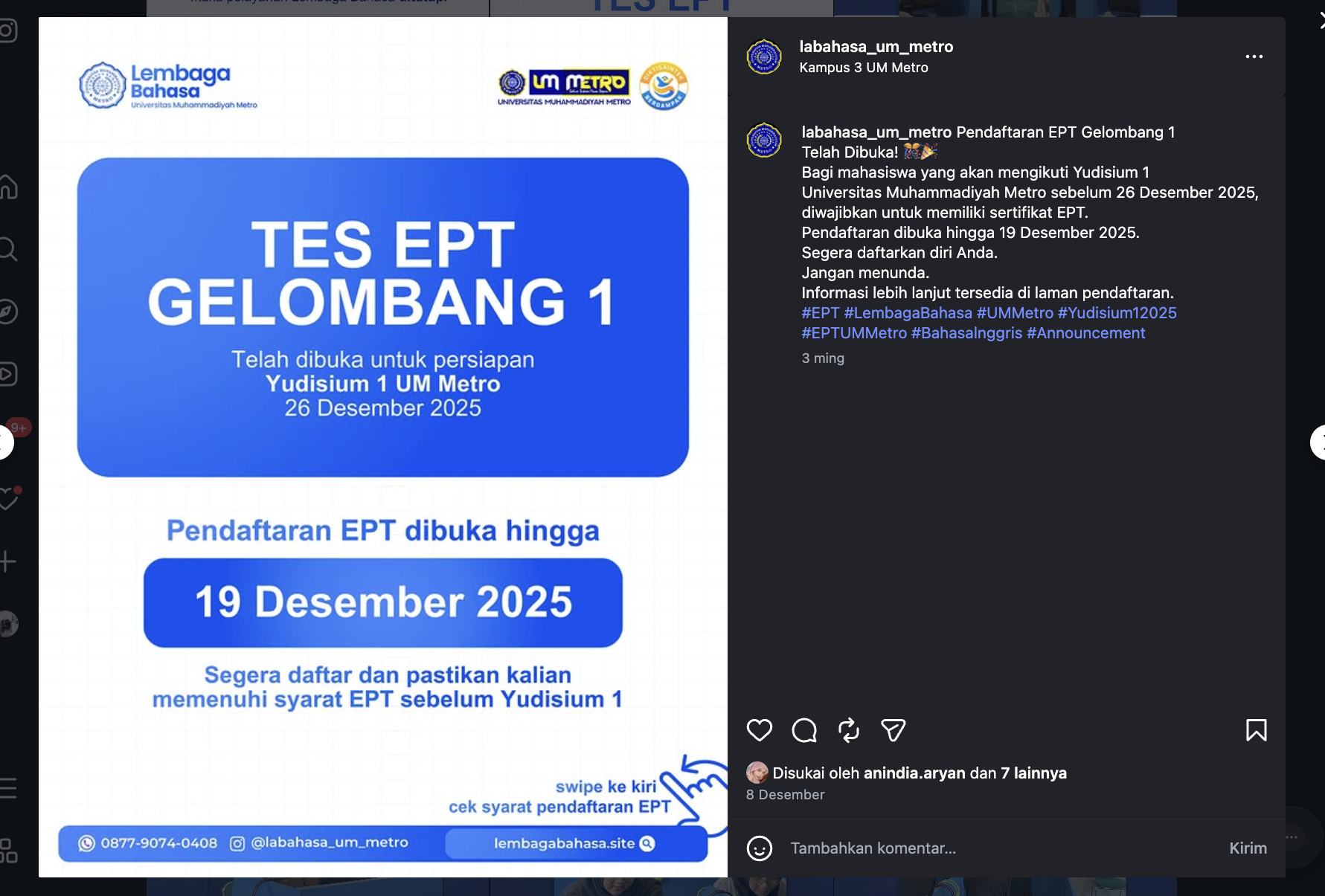 Bagi mahasiswa yang belum memiliki sertifikat EPT yang valid atau ingin memperbaiki skor, kesempatan ini diharapkan dapat dimanfaatkan sebaik-baiknya. Informasi teknis mengenai tata cara pendaftaran dan jadwal pelaksanaan tes dapat diakses langsung melalui akun Instagram resmi Lembaga Bahasa UM Metro.